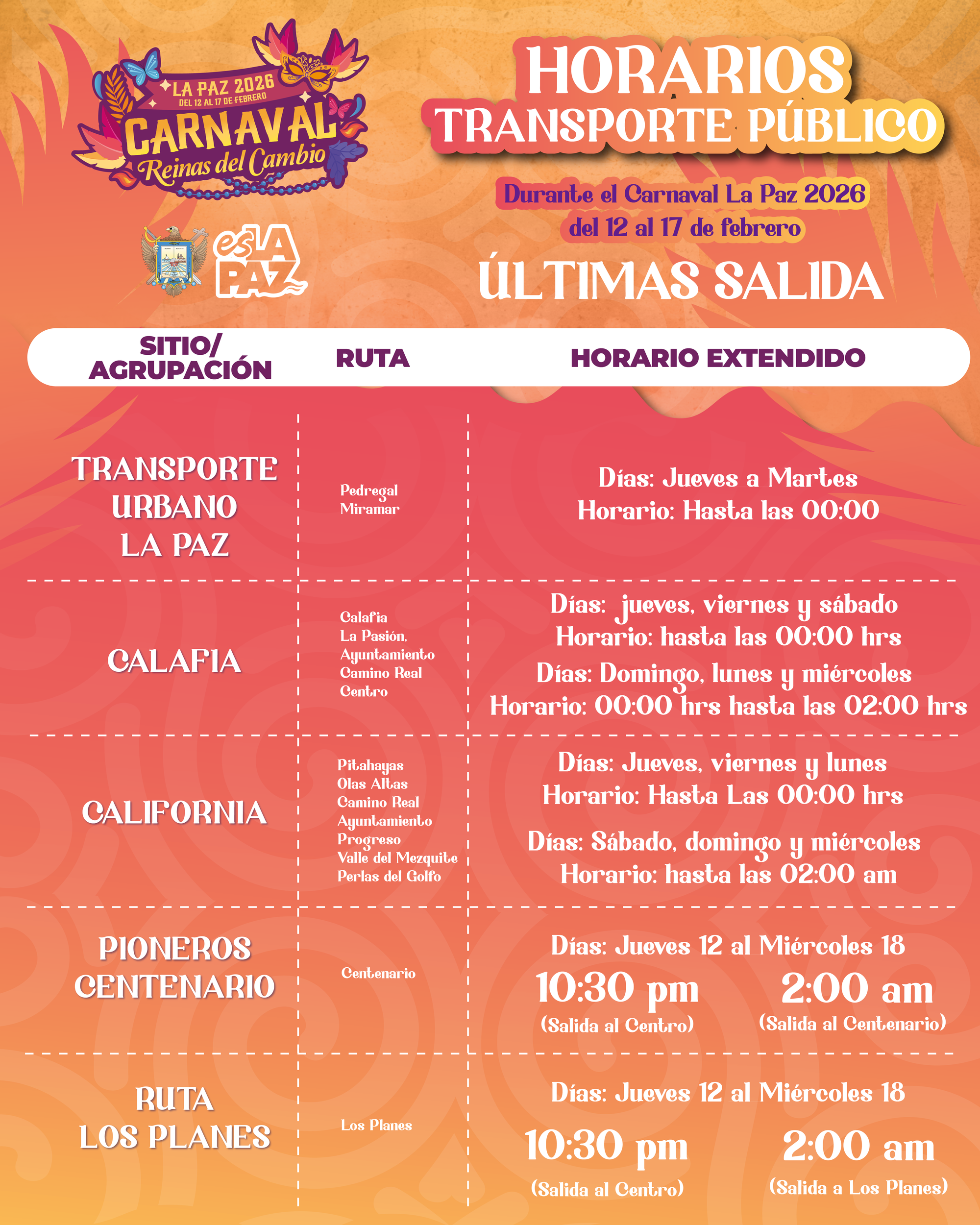 La Dirección General de Seguridad Vial y Transporte, informa a las y los usuarios del Tiburón Urbano, así como del Transporte Público Tradicional, que en acuerdo con los concesionarios, se ampliará el horario de funciones hasta las 02:00 horas en algunas rutas, con la finalidad de que los asistentes al Carnaval La Paz 2026 “Reinas del Cambio” se trasladen a sus hogares sin mayores inconvenientes al terminar los eventos.