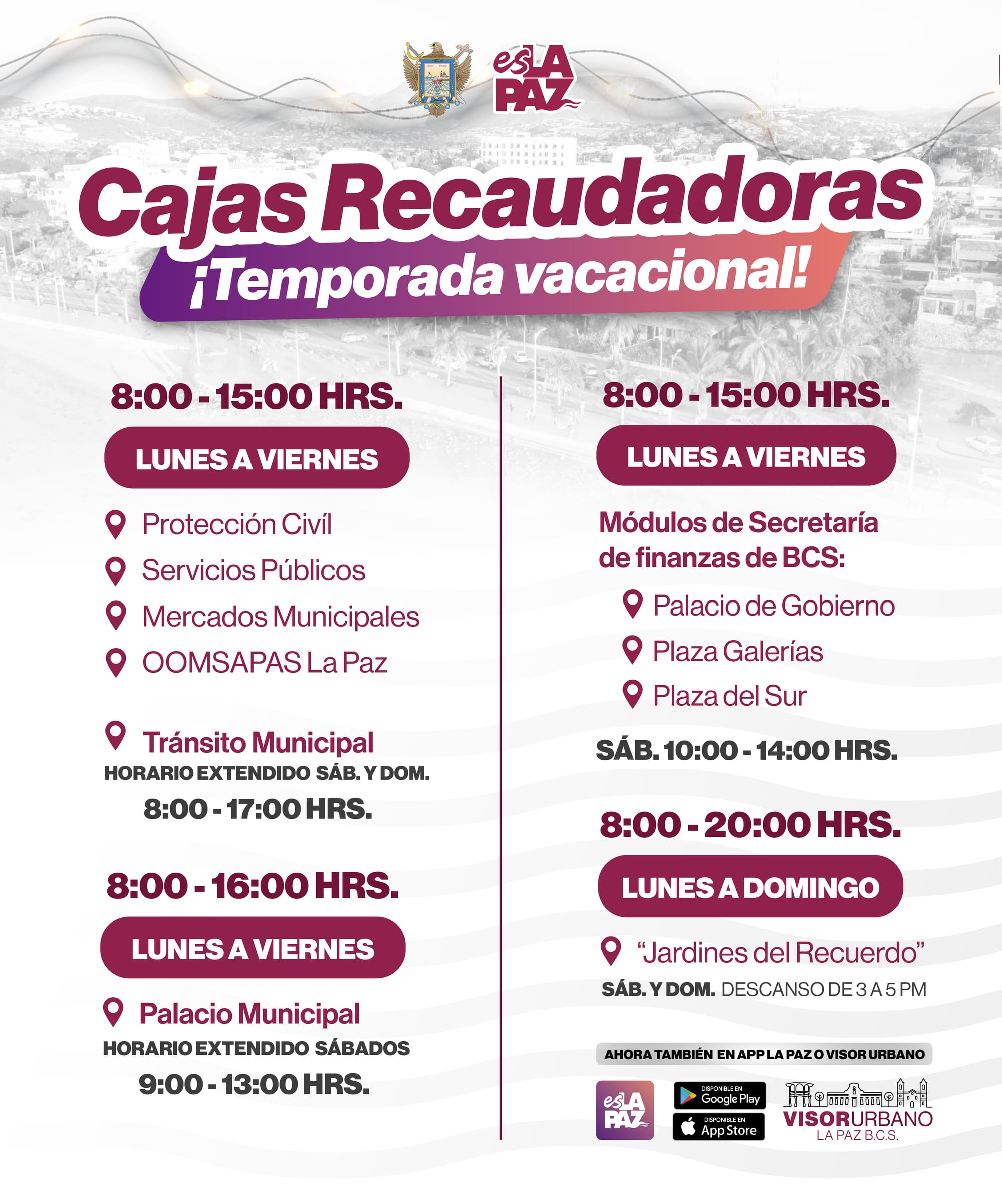 El Ayuntamiento de La Paz informa que a partir de este lunes 22 de diciembre, el horario de la caja recaudadora principal ubicada en el Palacio Municipal, será de 8:00 a 16:00 horas de lunes a viernes y sábados de 9:00 a 13:00 horas, excepto 25 de diciembre y 1 de enero.