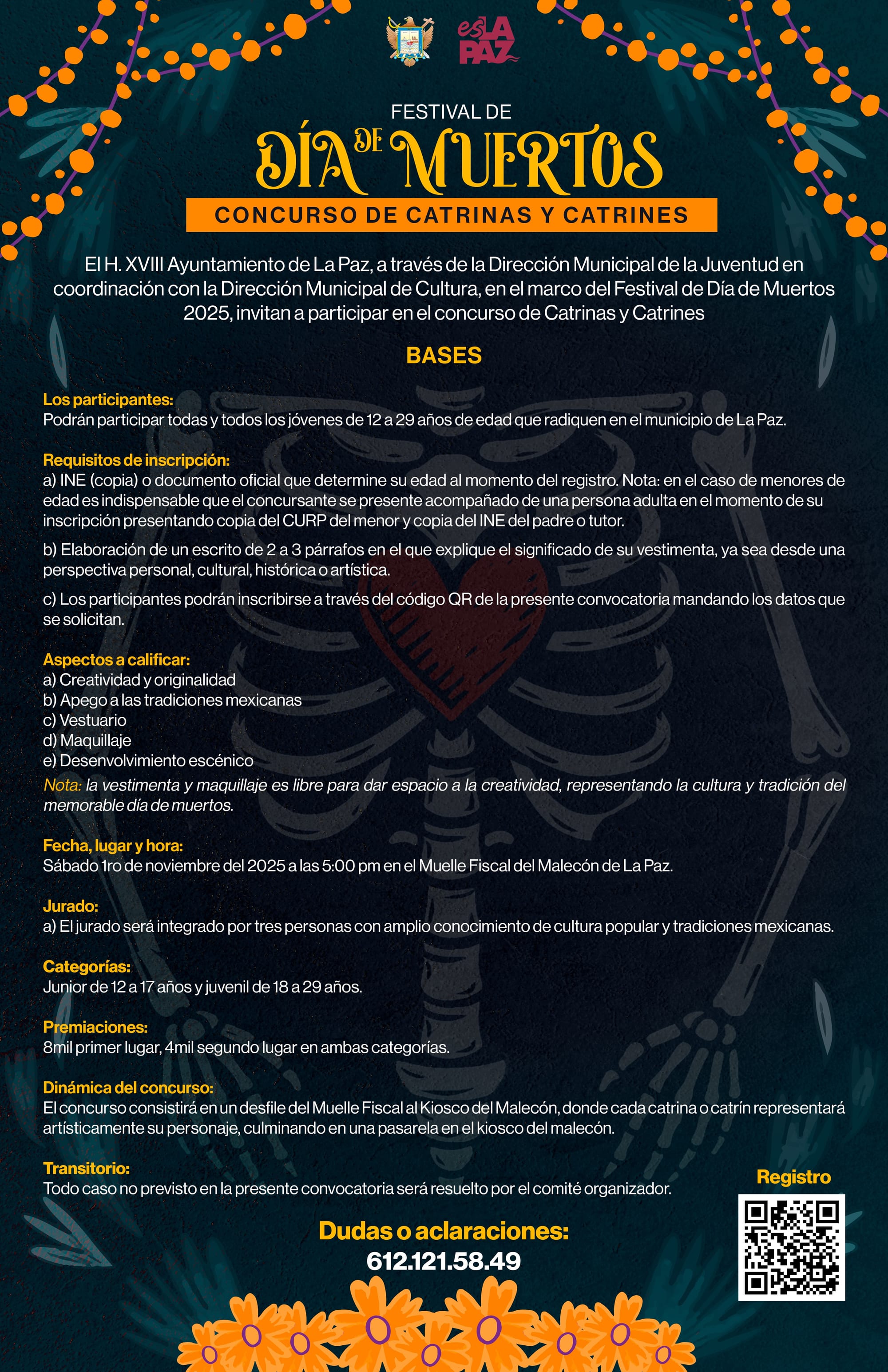 La Dirección Municipal de la Juventud del XVIII Ayuntamiento de La Paz, invita a las y los jóvenes de entre 12 y 29 años de edad a participar en el Concurso Juvenil de Catrinas y Catrines, el cual se realizará el 1 de noviembre en el paseo del Malecón como parte del Festival de Día de Muertos que organiza la Dirección Municipal de Cultura.