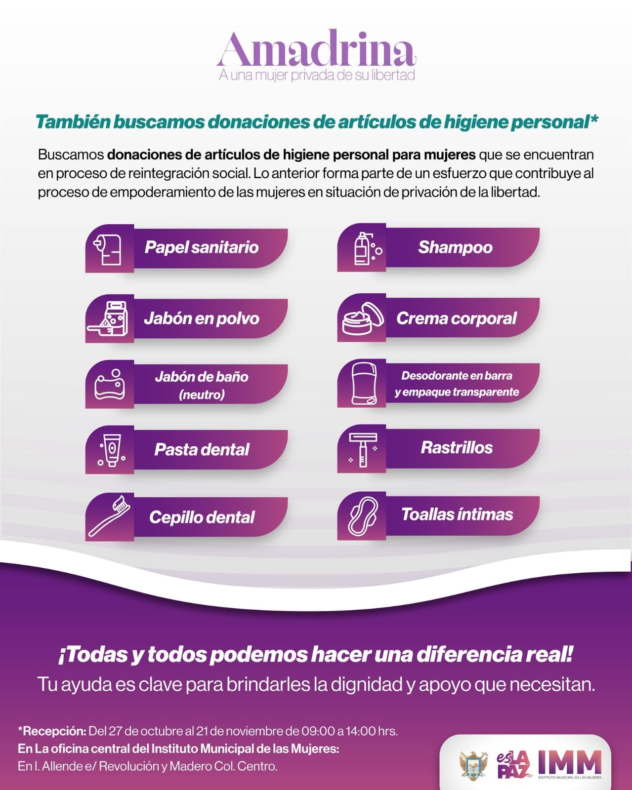 De igual manera, se buscan donaciones de artículos de higiene personal, entre ellos, papel sanitario, jabón en polvo y de baño (neutro), pasta y cepillo dental, shampoo, crema corporal, desodorante en barra en empaque transparente, rastrillos y toallas íntimas.