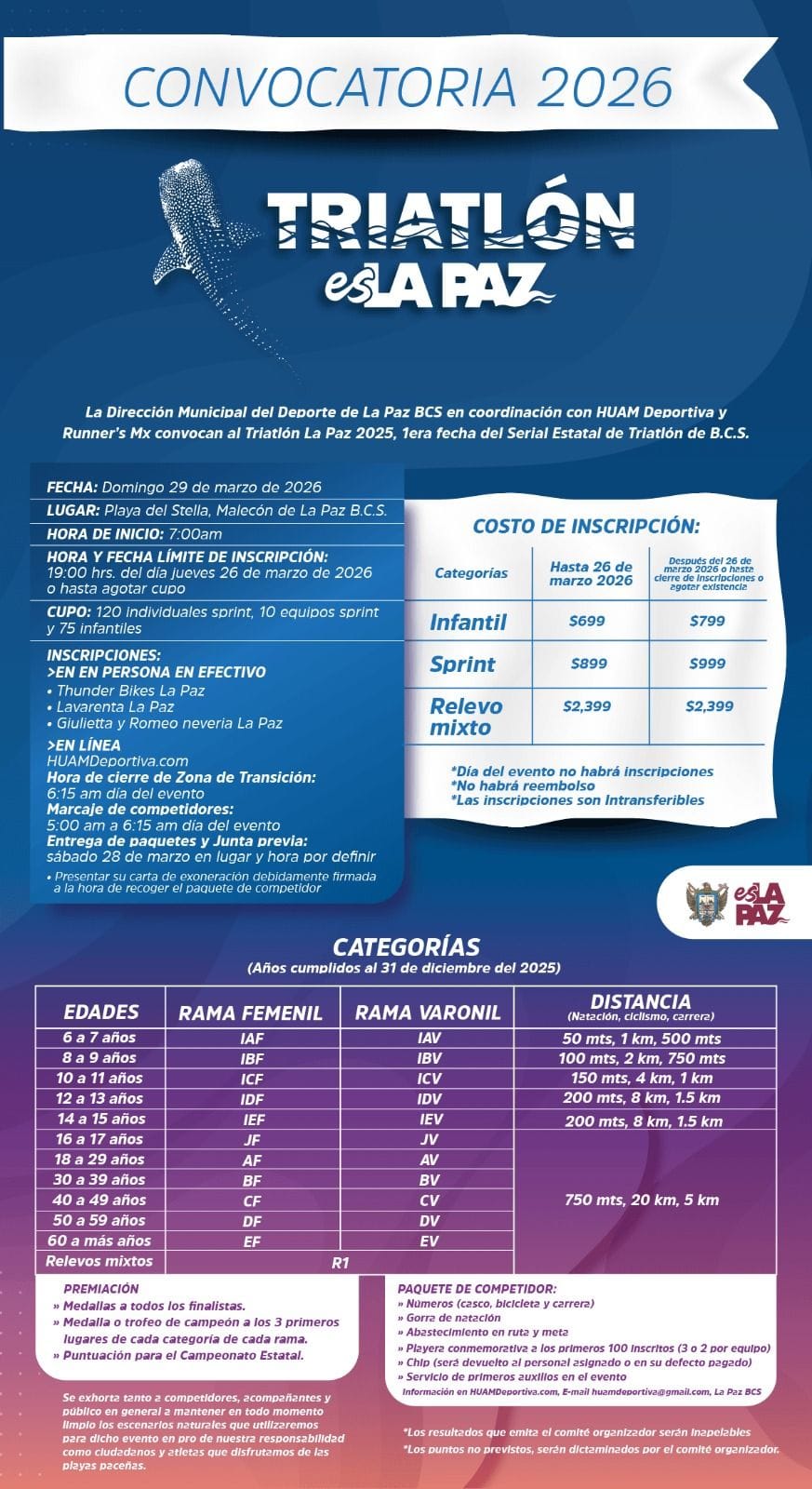 La Dirección Municipal del Deporte invita a triatletas y a la comunidad deportiva a participar en el Triatlón Es La Paz, primer evento del Serial Estatal de Triatlón de Baja California Sur que se llevará a cabo el 29 de marzo a partir de las 07:00 de la mañana, informó, Guillermo Ortalejo Hernández, titular del deporte.