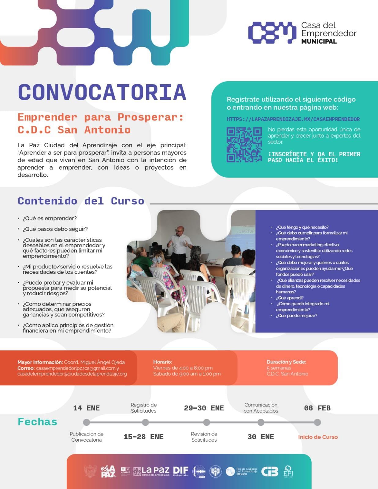 El gobierno municipal de La Paz y la Casa del Emprendedor Municipal, invitan a las y los habitantes de San Antonio a participar en el curso gratuito “Emprender para Prosperar”, como parte de los programas que ofrece la Red de Ciudades del Aprendizaje de la UNESCO.