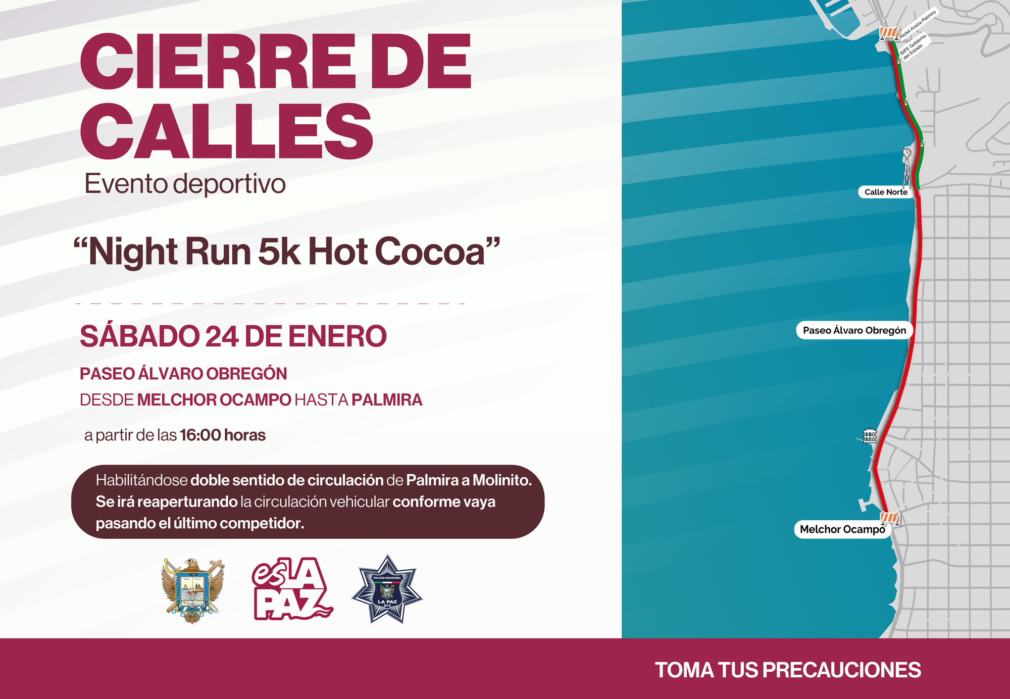 La Policía Municipal a través de la Dirección de Movilidad y Seguridad Vial implementará un dispositivo de cierres viales en el Paseo Álvaro Obregón y calles del Centro Histórico, con la finalidad de garantizar que participantes y asistentes de la “Night Run 5k hot COCOA”, así como de la Peregrinación por La Paz, se encuentren seguros.