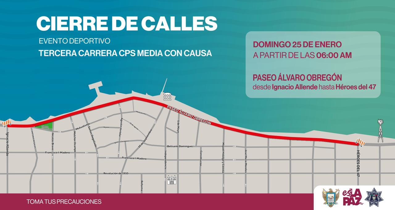 En ese sentido, para el desarrollo del evento deportivo, el domingo 25 de enero del 2026, se procederá al cierre vial del Paseo Álvaro Obregón, a partir de las 06:00 de la mañana, en el tramo de la calle Ignacio Allende a Héroes del 47, restableciendo la circulación vehicular de manera habitual una vez que el último corredor concluya el recorrido.