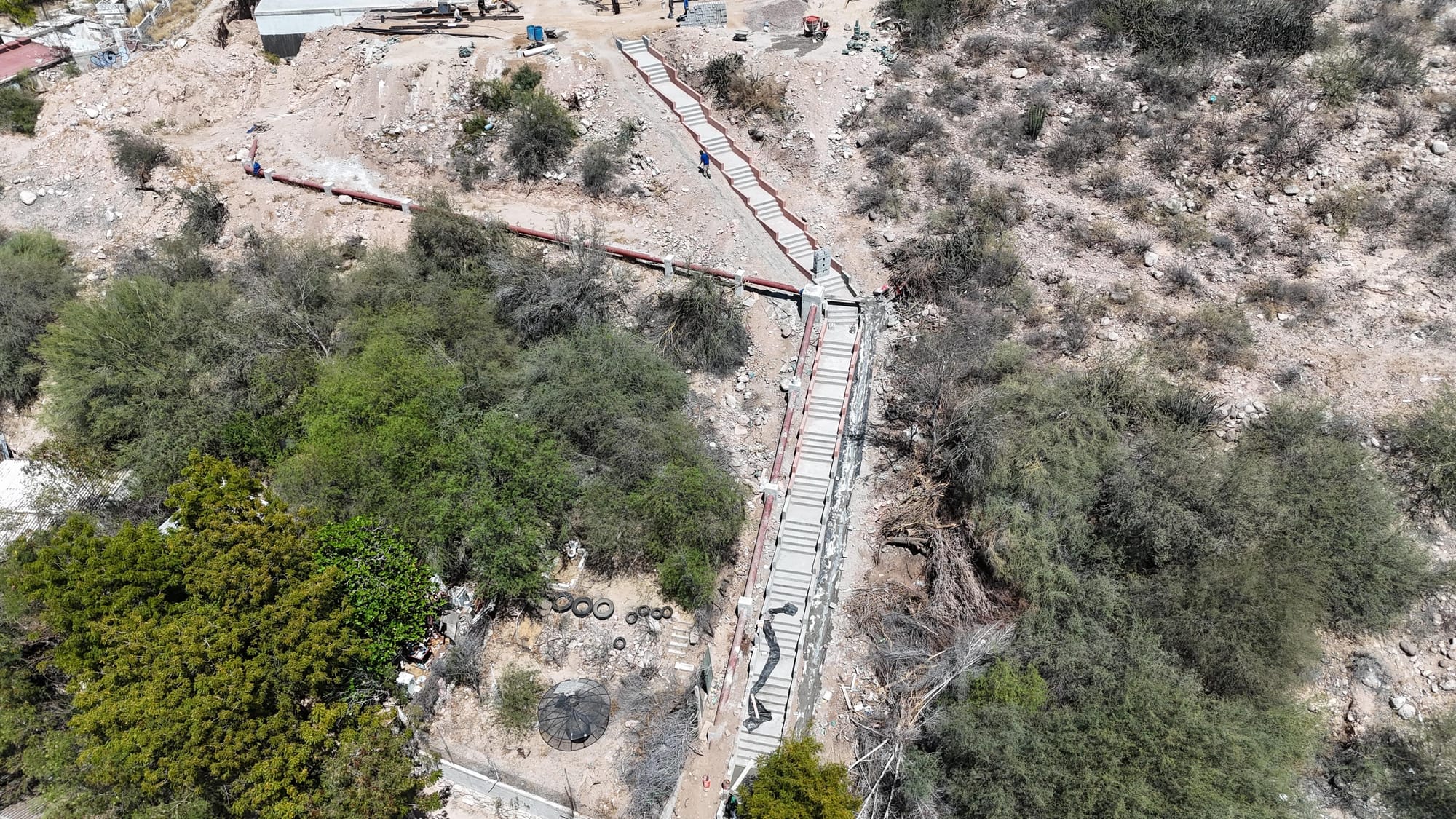 El H. XVIII Ayuntamiento de La Paz informa sobre los avances en las obras de infraestructura urbana que se desarrollan en la colonia Colina de la Cruz, destacando progresos significativos tanto en la construcción del Parque Mirador como en la escalinata que conectará esta zona con las colonias aledañas.